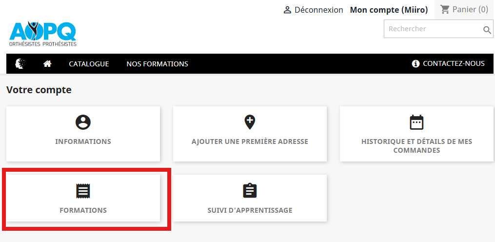 Pour vous rendre sur votre tableau de bord, cliquez sur le lien « Mon compte (Votre prénom) » en haut à droite de l’écran. Puis, cliquez sur la section « Formations ».