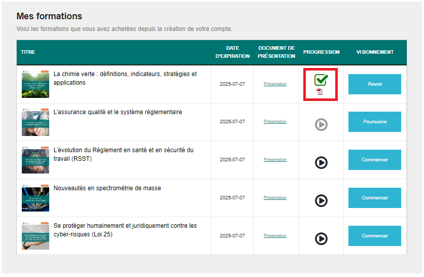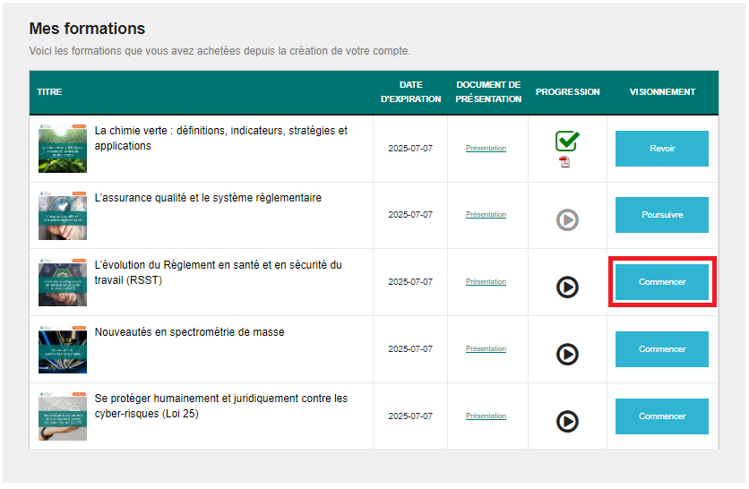 Une fois la liste de vos formations affichée, choisissez celle que vous désirez visionner et cliquez sur le bouton « Commencer ».